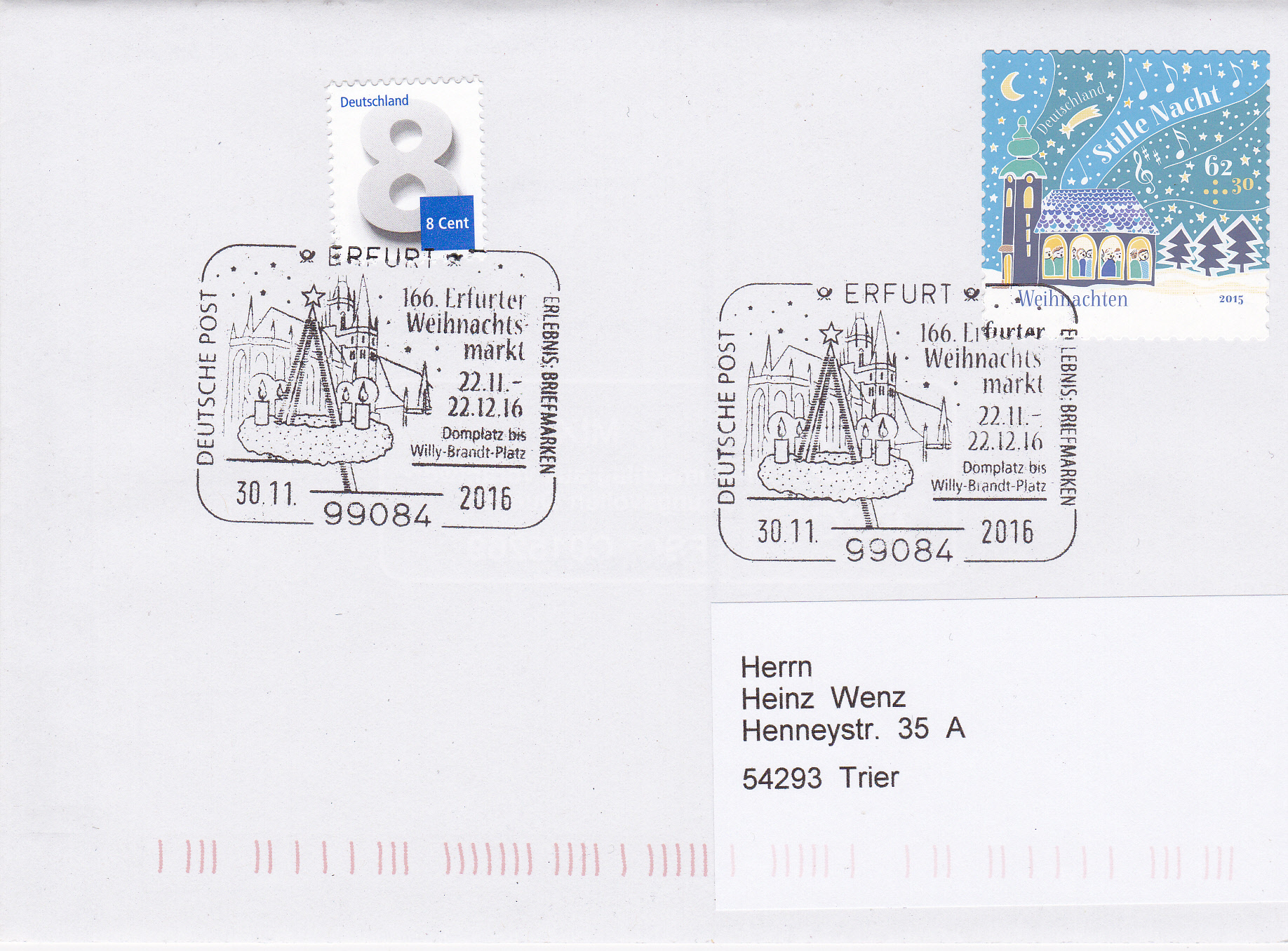 Sonderstempel vom 30.11 2016 aus Erfurt zum 166. Erfurter Weihnachtsmarkt mit der Abbildung des Erfurter Domes und einer Weihnachtspyramide mit Adventskranz.