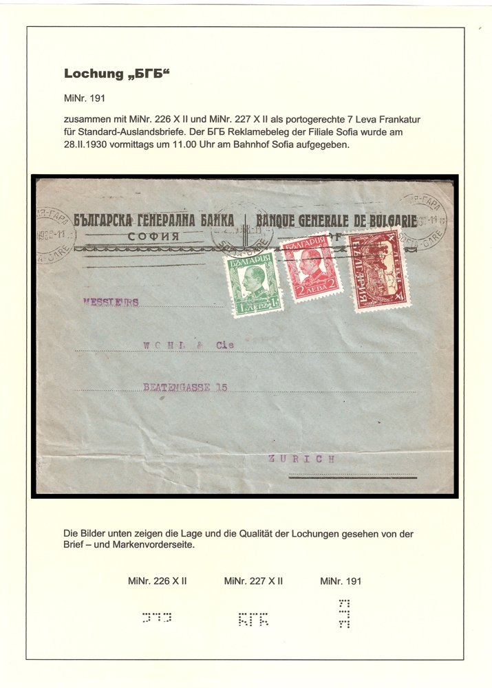 Es gab zu der Zeit, 1923-1924, einen massiven Mangel an Freimarken in Bulgarien und es wurde den Schalterbeamten erlaubt auch Portomarken zur Frankatur zu verwenden. Demzufolge konnten auch die Banken und Firmen nur Portomarken erwerben um diese mit ihren Lochungen zu versehen. Das Korrespondenzaufkommen der Banken und Firmen war- und ist natürlich wesentlich geringer als die sämtlicher Privatpersonen, deshalb die relative Seltenheit der gelochten Marken auf Belegen.