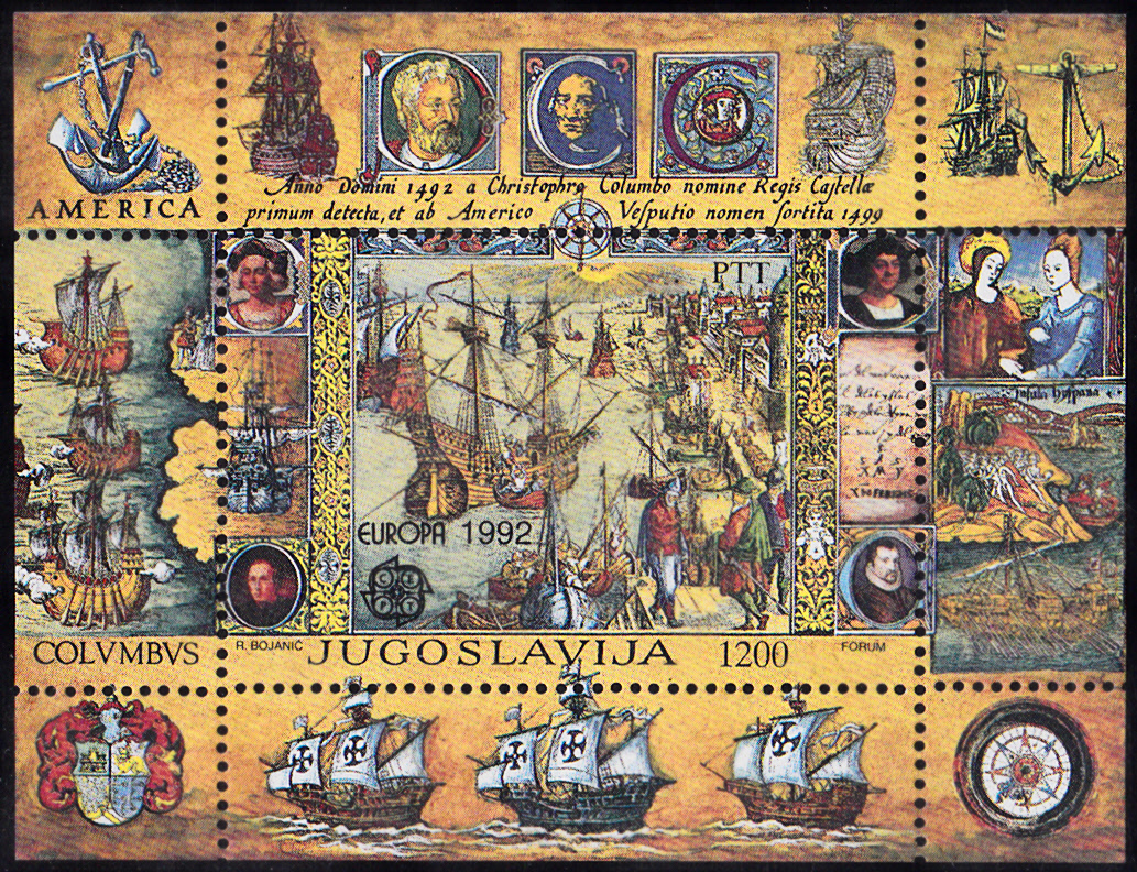 Die Europamarken 1992 aus Jugoslawien zum Gemeinschaftsthema "500. Jahrestag der Entdeckung von Amerika" sind am 5. Mai 1992 erschienen. Es erschien auch eine Blockausgabe mit einer Marke zu 1200 Dinar (MiNr 2536) mit der Abbildung "Hafen von Lissabon" nach einem alten Stich. Die Auflage des Blockes betrug 200 000 Stück. Hier ein Postfrisches Exemplar.