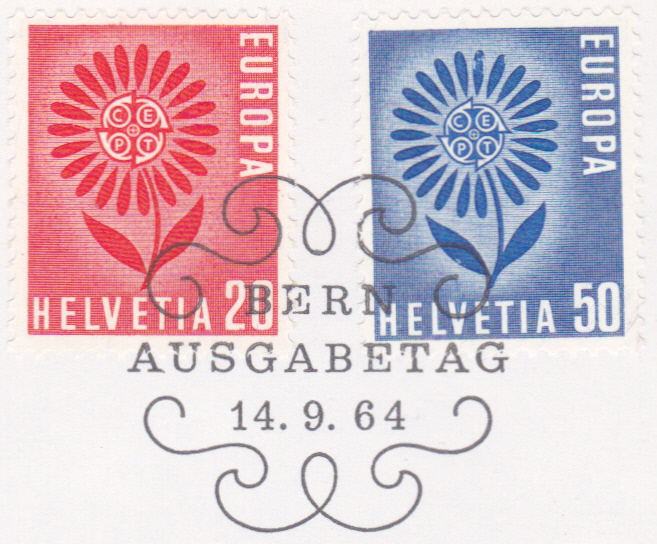 In der Schweiz erschienen die Europamarken 1964 am 14. September 1964 im Gemeinschaftsmotiv "Stilisierte Blume mit 22 Blütenblättern um CEPT-Emblem". Hier die Marke zu 20 Rappen lebhaftrot, die in einer Auflage von 52 420 000 Stück erschien.