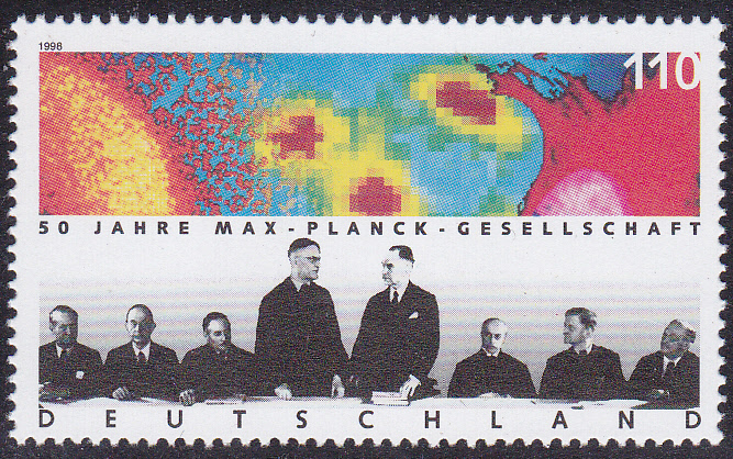 Auf der Marke zum Jubiläum "50 Jahre Max-Planck-Gesellschaft zur Förderung der Wissenschaften e.V." sind die Teilnehmer der Gründungssitzung der Max-Planck-Gesellschaft am 26. Februar 1948 in Göttingen abgebildet (von links nach rechts): Dr. Theo Goldschmidt (Senator der MPG), Dr. Wilhelm Bötzkes (Schatzmeister der MPG),Professor Erich Regener (Vizepräsident der MPG), Adolf Grimme (Kultusminister des Landes Niedersachsen), Professor Otto Hahn (Präsident der MPG,Nobelpreisträger für Chemie des Jahres 1944), Professor Max von Laue (Nobelpreisträger für Physik des Jahres 1914), Professor Richard Kuhn (Nobelpreisträger für Chemie des Jahres 1938) und Professor Adolf Windaus (Nobelpreisträger für Chemie des Jahres 1928).