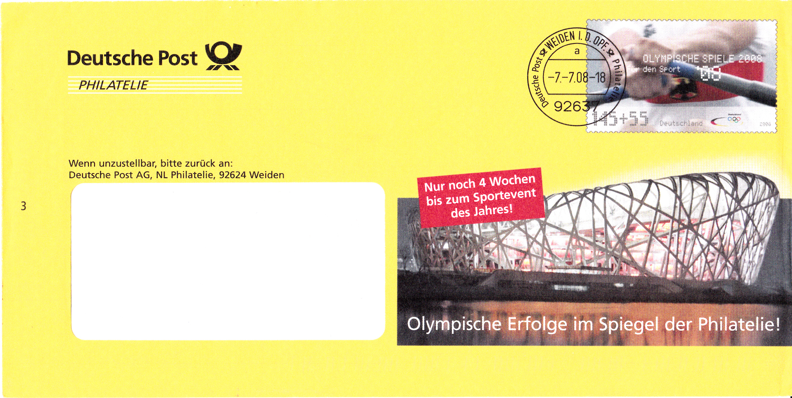 Hier noch ein weiterer Ganzsachenumschlag (MiNr EA F329) im Format 229x114 mm mit einem Wertstempel der 145+55 Cent-Marke "Olympische Spiele 2008, Rudern" (MiNr 2652) aus der Serie für die Sporthilfe 2008. Die Vorausentwertung trägt das Datum "11.-6.08".
