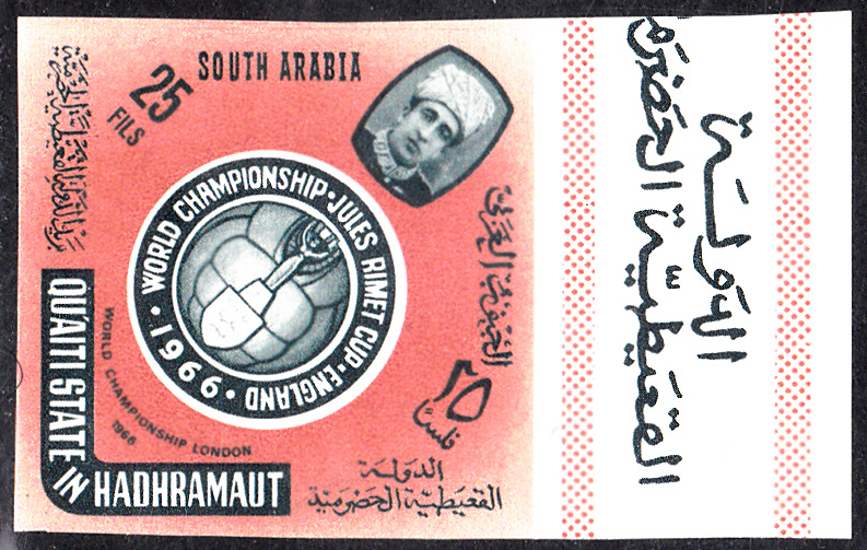 Die Motive wiederholen sich ab der Marke zu 25 Fils. Hier wieder nur die geschnittene Version (MiNr 75B) mit dem Emblem der Fußball-WM 1966.