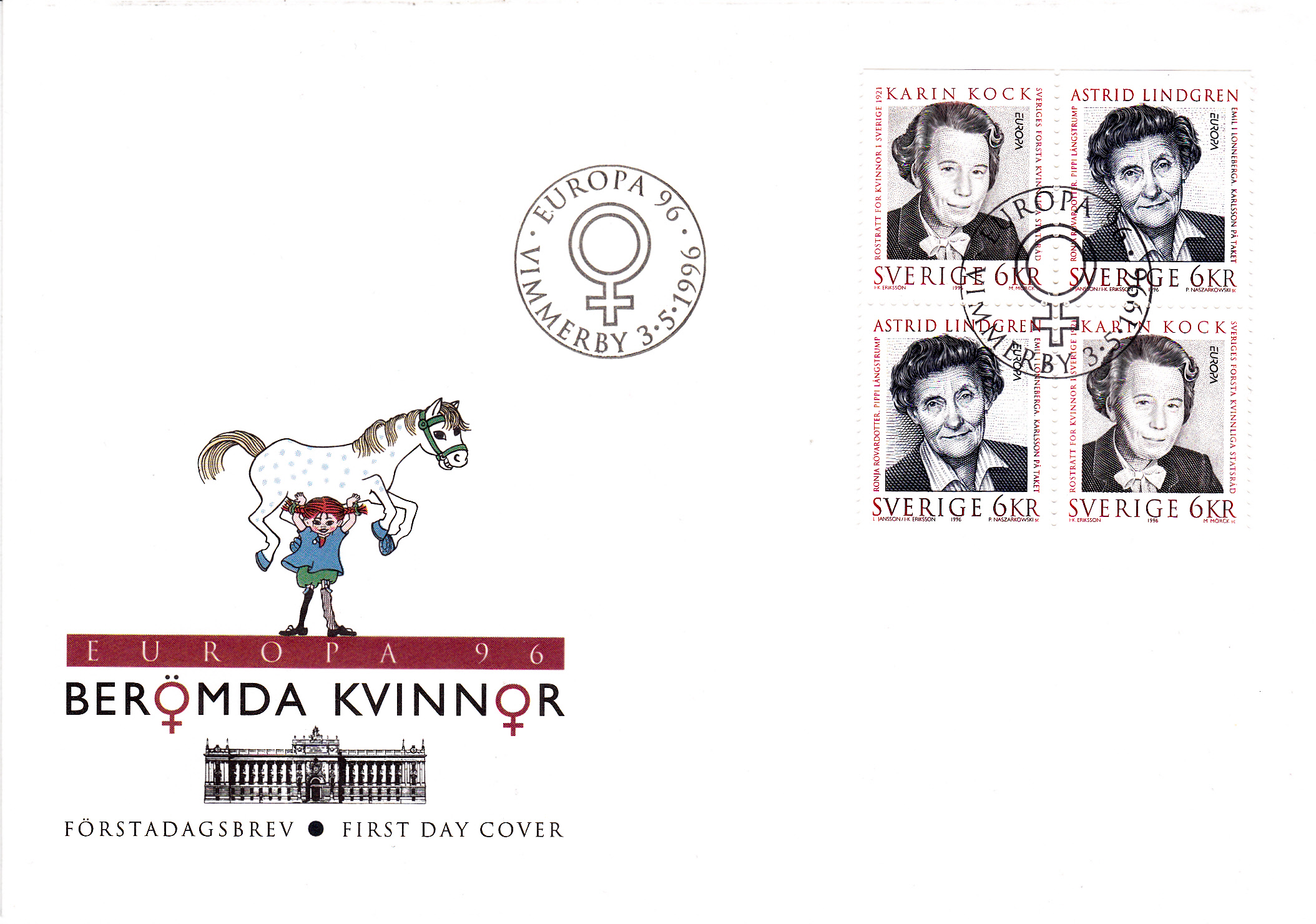 In Schweden erschienen die Europamarken 1996 am 3. Mai 1996 zum Gemeinschaftsthema "Berühmte Frauen". Hier eine Marke zu 6 Kronen mit einem Porträt von Karin Kock (1891-1976), Politikerin. Sie wurde 1947 die erste schwedische Ministerin.