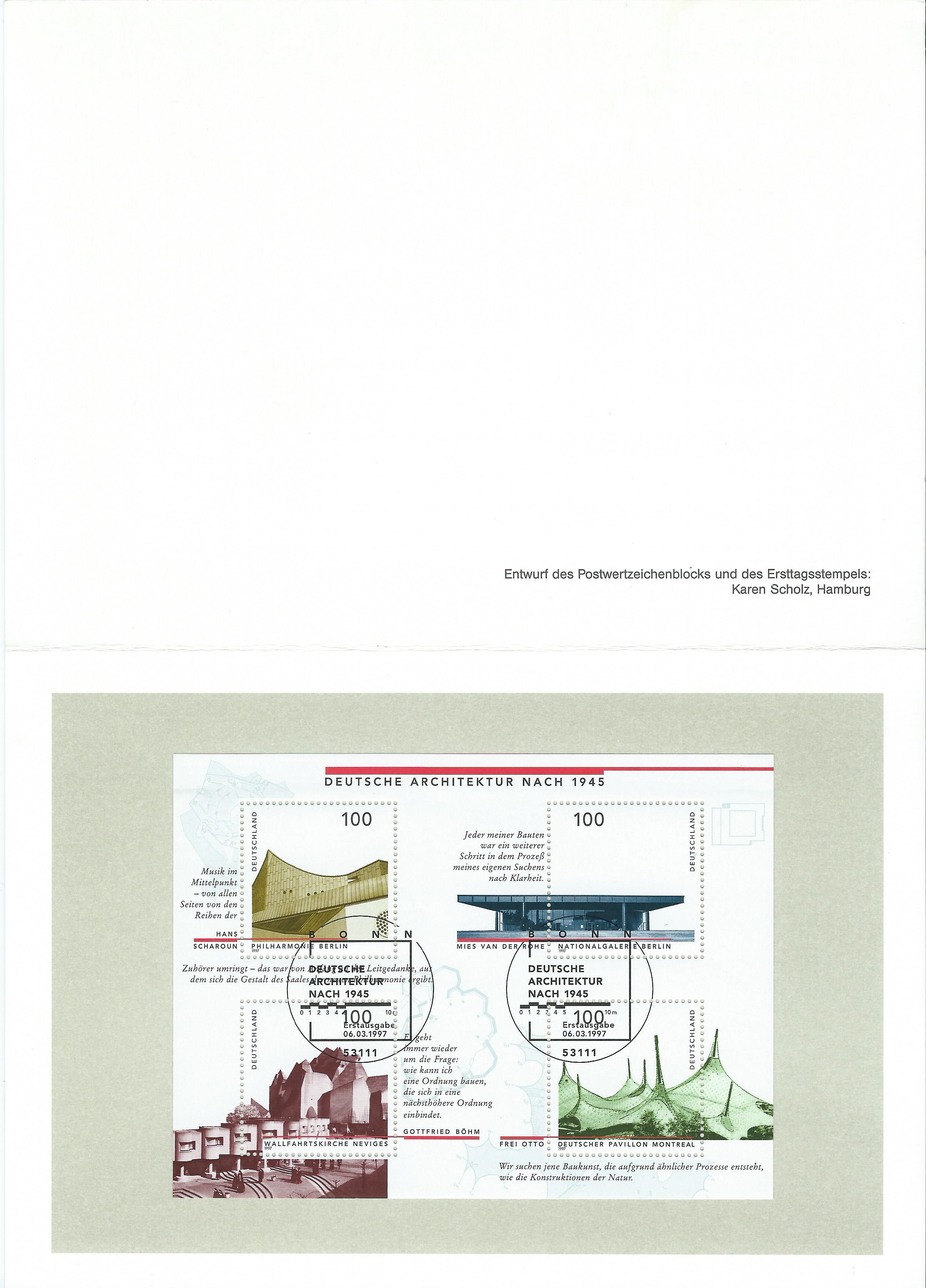 Gefolgt von einer "echten" Ministerkarte mit Unterschrift vom Postminister Bötsch. Ausgabeanlass war für den Block 37 die Deutsche Architektur nach 1945. Aufgeklappt erreicht die Karte fast DIN-A-4-grösse ;)