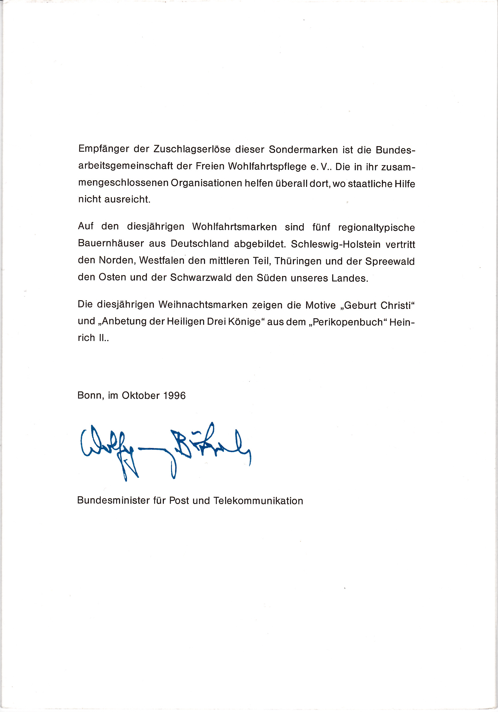 Hier mal wieder eine etwas ältere Ministerkarte aus der Amtszeit des Bundesministers für Post und Telekommunikation Wolfgang Bötsch. Wie zu der damaligen Zeit bei Zuschlagsmarken üblich, wurden hier die Wohlfahrtsmarken 1997 in Viererblöcken eingeklebt. Die Karte ist nach dem Auseinanderklappen dreiteilig. Für die Weihnachtsmarken gab es eine zweite Klappkarte, die einfach innen beigelegt war, daher bezieht sich der Text auf der Vorderseite auf beide Ausgaben. Die Karte mit den Weihnachtsmarken liegt mir aber zur Zeit nicht vor.