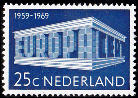 In den Niederlande sind die Europamarken 1969 am 28. April 1969 mit dem Gemeinschaftsmotiv "„EUROPA“ und „CEPT“ in Tempelform" erschienen. Hier der Wert zu 25 Cent schwarzblau, der in einer Auflage von 31 577 230 Stück erschien. Die Marke gibt es aus dem Bogen und von der Rolle. Von der Rolle trägt jede 5. Marke eine Nummer.