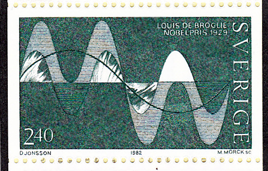 In Schweden erschien 1982 in einem Markenheftchen "Nobelpreisträger für Atomphysik" (MiNr MH 91) auch diese Marke für Louis de Broglie (MiNr 1216). Die Marke zeigt die Welleneigenschaft der Elementarteilchen nach Louis de Broglie.