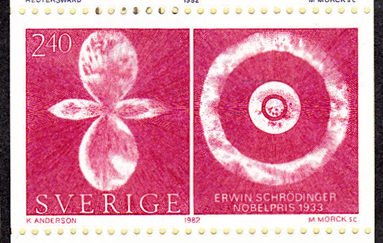 In Schweden erschien 1982 in einem Markenheftchen "Nobelpreisträger für Atomphysik" (MiNr MH 91) auch diese Marke für Erwin Schrödinger (MiNr 1215). Die Marke zeigt Atomorbitale nach der Quantentheorie von Erwin Schrödinger.