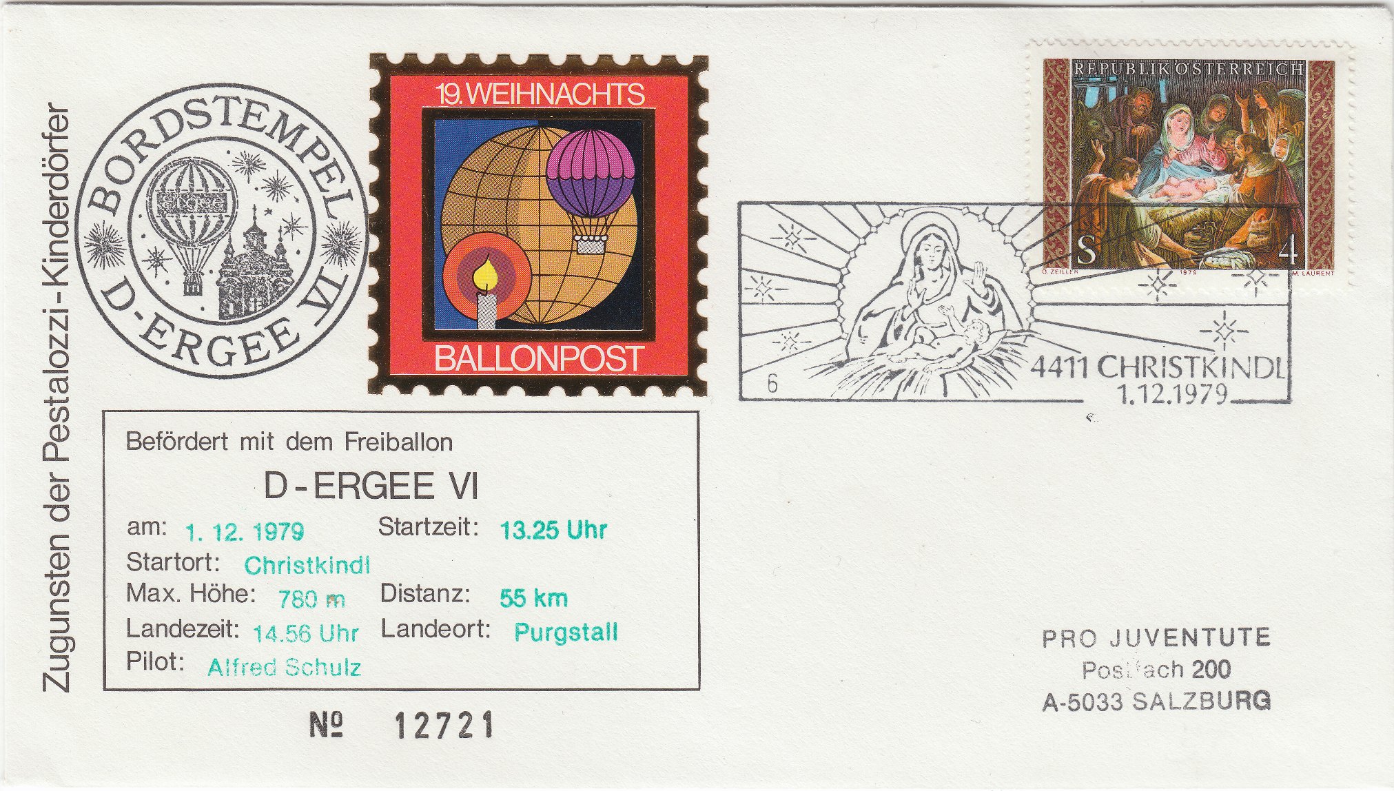 Nach den von Heinz gezeigten Beförderungen per Flugzeug und Luftschiff hier eine am 01.12.1979 per Freiballon D-ERGEE VI von Christkindl nach Purgstall beförderte "19.WEIHNACHTSBALLONPOST":