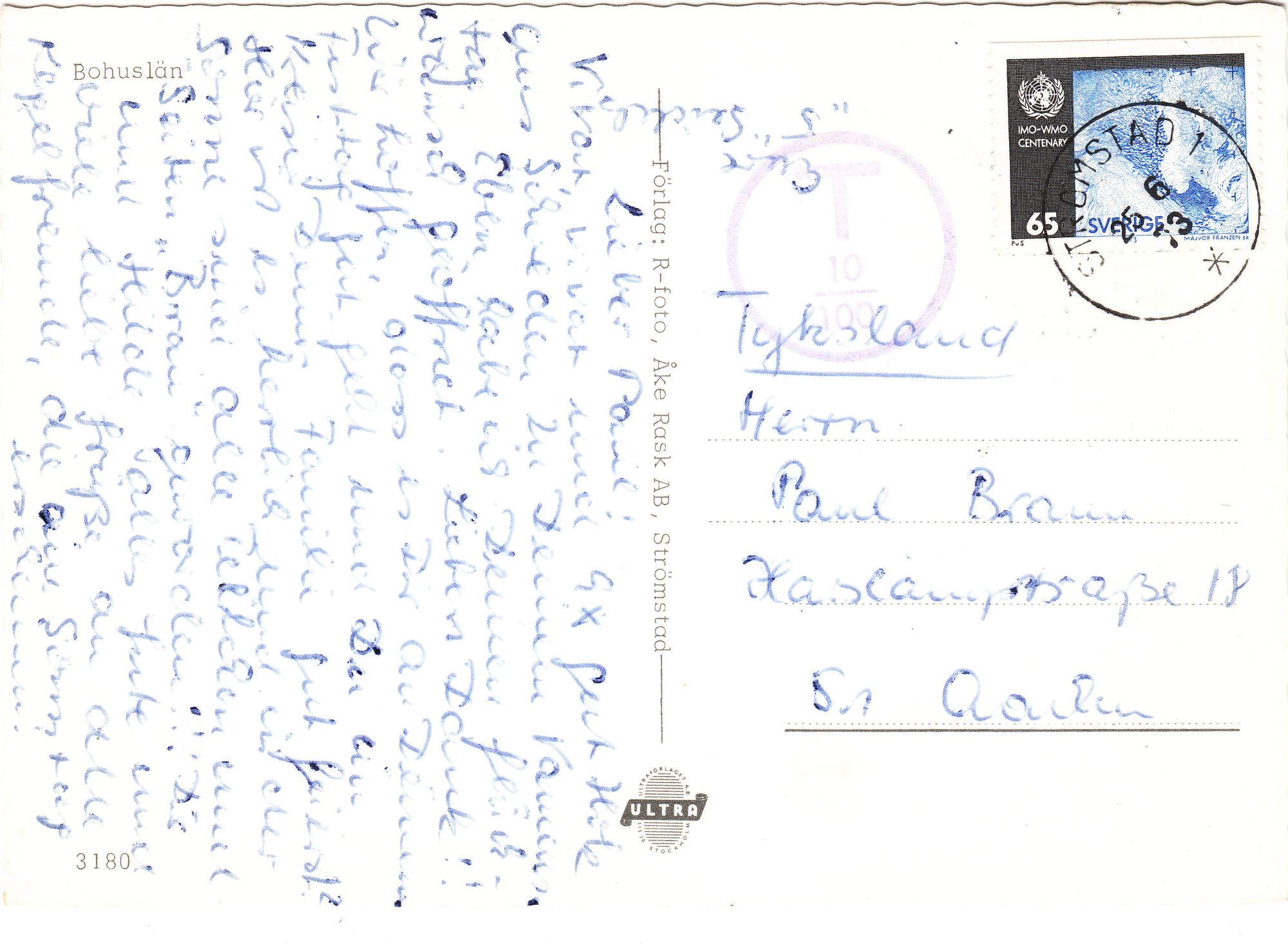 Zum 100. Jubiläum erschien in Schweden dieses Postwertzeichen, hier als EF verwendet auf einer somit um 10 Öre unterfrankierten Postkarte nach Deutschland: