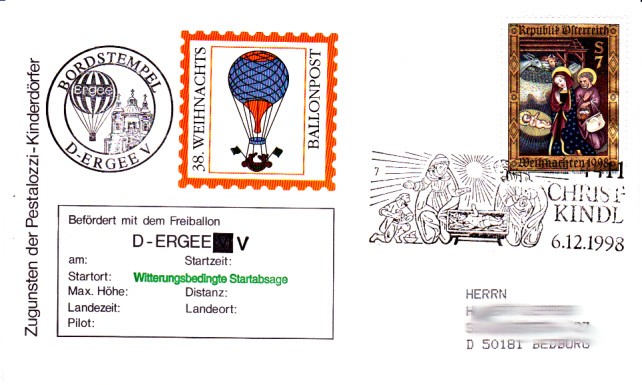 Die 38.Weihnachtsballonpost sollte mit dem Freiballon D-ERGEE V am 6.12.1998 durchgeführt werden. Sie wurde allerdings wittersbedingt abgesagt, wie der Zusatz auf dem Beleg bestätigt.
