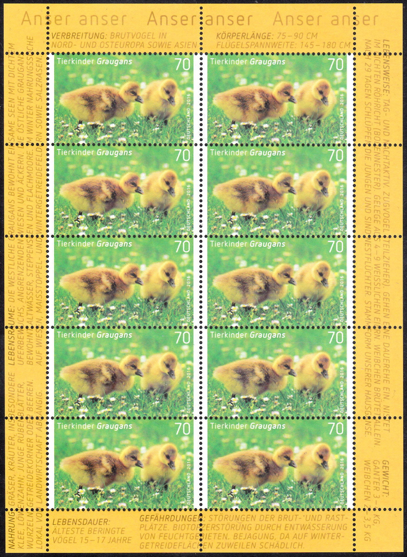 Bei der Deutschen Post AG erschien am 1.3.2016 eine Marke (MiNr 3218) mit der Abbildung von zwei Graugansküken.