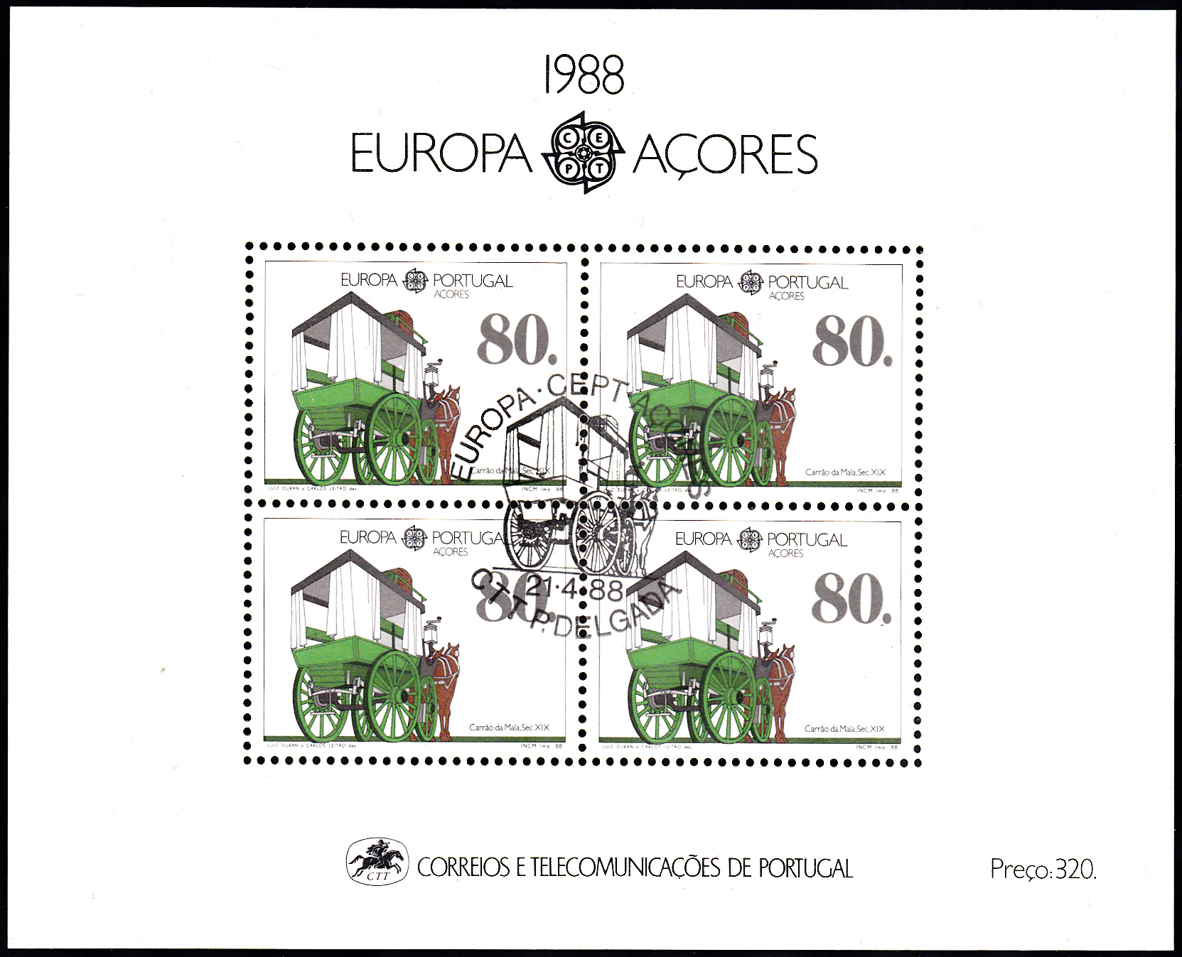 Die Europamarke 1988 erschien in Portugal Azoren am 21. April 1988 auch als Block mit vier Marken zu 80 Escudo mit einer Abbildung eines Pferdeomnibusses auf São Miguel (19. Jh.). Die Auflage betrug 190 000 Blocks. Die Hintergrundfarbe der Blockmarke (MiNr 390 b) ist weißgelborange. Sie unterscheidet sich von der Marke aus dem Bogen; die Bogenmarke (MiNr 390 a) hat die Hintergrundfarbe weiß.