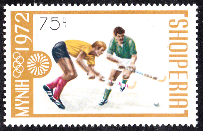 Diese Marke aus Jugoslawien ist zu den Olympischen Spielen 1980 in Moskau erschienen. Sie zeigt einen Ball, einen Teil eines Schlägers und die Füße eines Spielers beim Feldhockey.