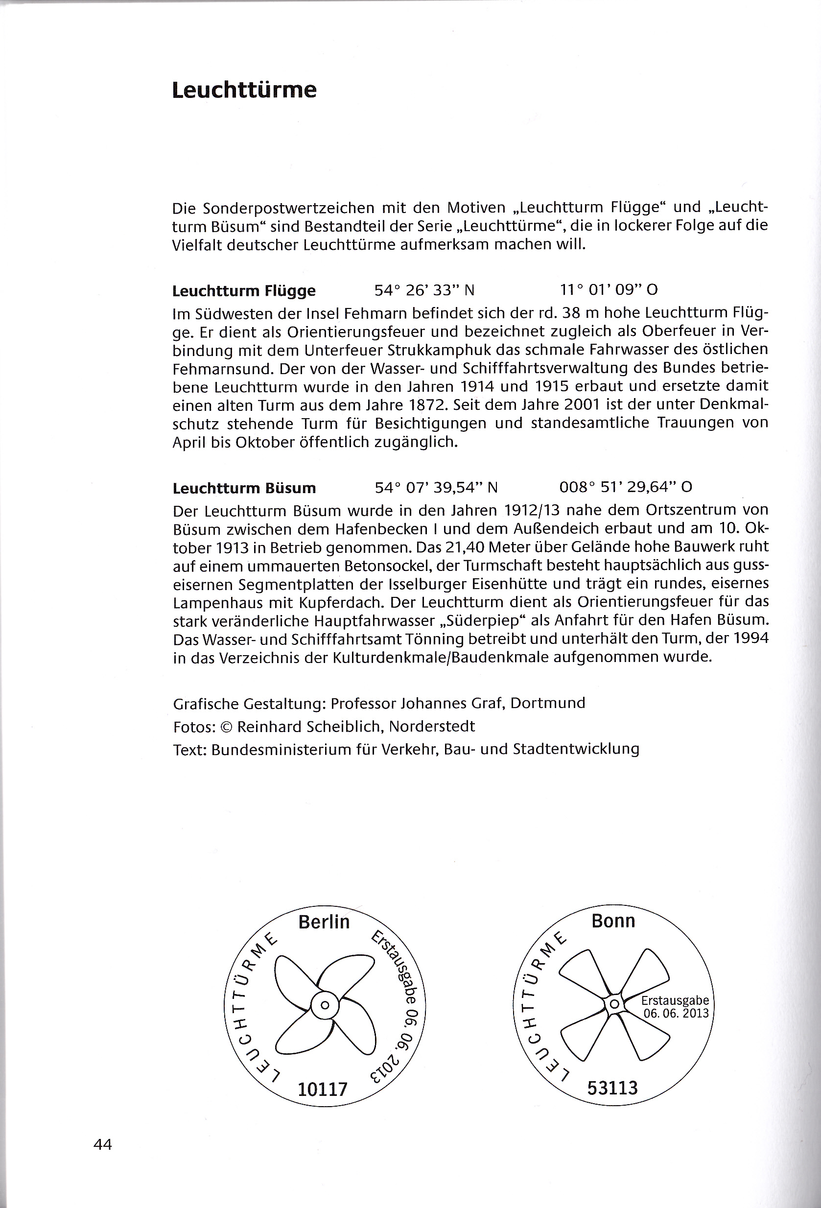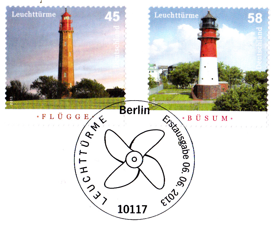 Und hier kommen wir gleich zu der zweiten Marke des Jahres 2013 (MiNr 3011) aus der Leuchtturmserie mit dem Leuchtturm Büsum. Der Leuchtturm Büsum ist ein Leuchtturm an der deutschen Nordseeküste in Schleswig-Holstein. Ein Vorgängerbau war ein 1875 errichtetes hölzernes Bauwerk mit einer Laterne, die hinaufgezogen werden musste. Der heutige Turm wurde in den Jahren 1912/1913 als Leit- und Orientierungsfeuer errichtet und besitzt eine Höhe von 21,4 Metern.