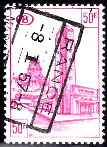 Diese Eisenbahnpaketmarke aus der Ausgabe von 1953/56 mit Abbildungen zur "Nord-Süd-Verbindung in Brüssel" in der Wertstufe zu 30 Franc mit der Abbildung "Bahnhof Brüssel Süd" ist als MiNr. 313 katalogisiert.