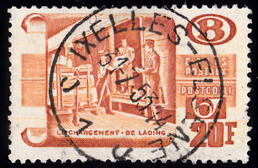 Diese Postpaketmarke zu 20 Francs aus der gleichen Serie mit dem Motiv "Verladung in Bahnwagen" hat die MiNr 37. Sie ist mit einem Bahnstempel entwertet.