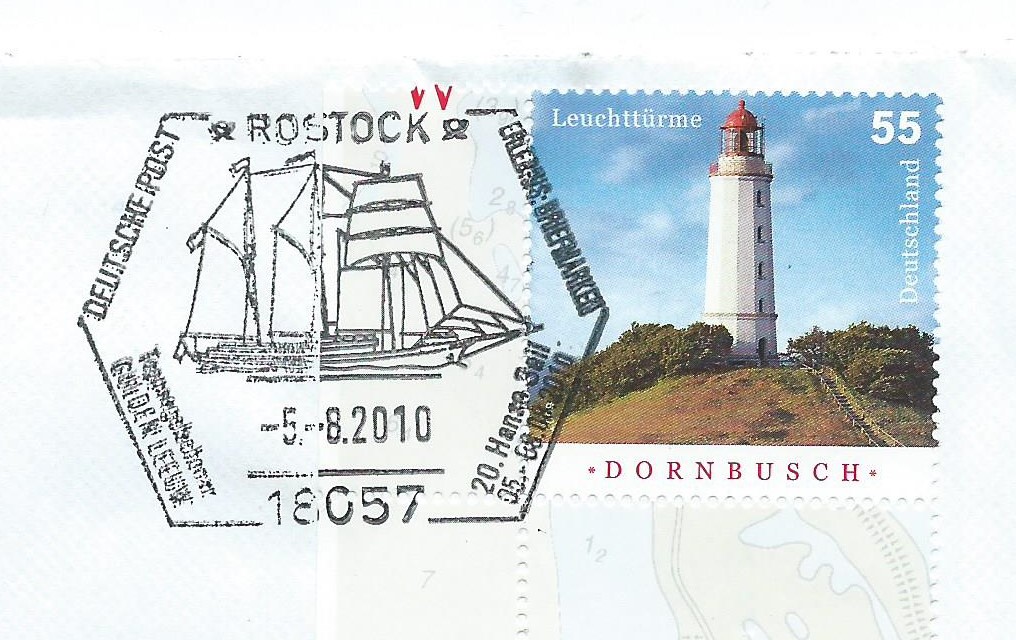 Der nächste Ausschnitt zeigt den Leuchtturm von Dornbusch auf der Insel Hiddensee (Mi.Nr. 2743). Hier weitere Infos: https://de.wikipedia.org/wiki/Leuchtturm_Dornbusch" target="_blank Passend zum Motiv der Marke ein Segelschiff im Sonderstempel von Rostock vom 5.8.2010, welches den Weg geleuchtet bekommt...