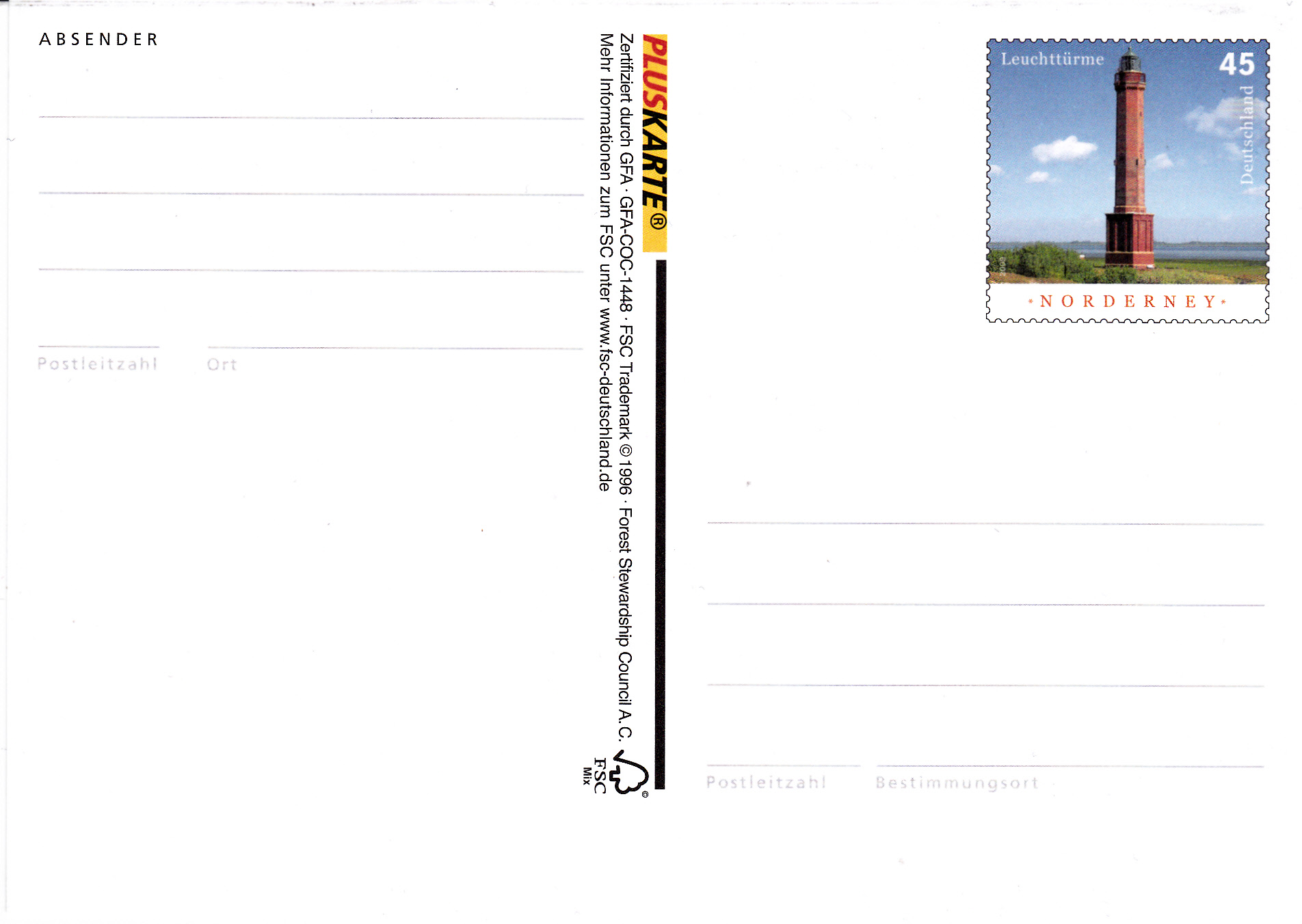 Pluskarte (MiNr PSo 103 I) mit einem Wertstempel Leuchtturm Norderney (MiNr 2742) und mit Absendervordruck. Der FSC-Vermerk ist mit der Zertifizierungsnummer "GFA-COC-1448". Die Karte gibt es auch mit anderen FSC-Vermerken.