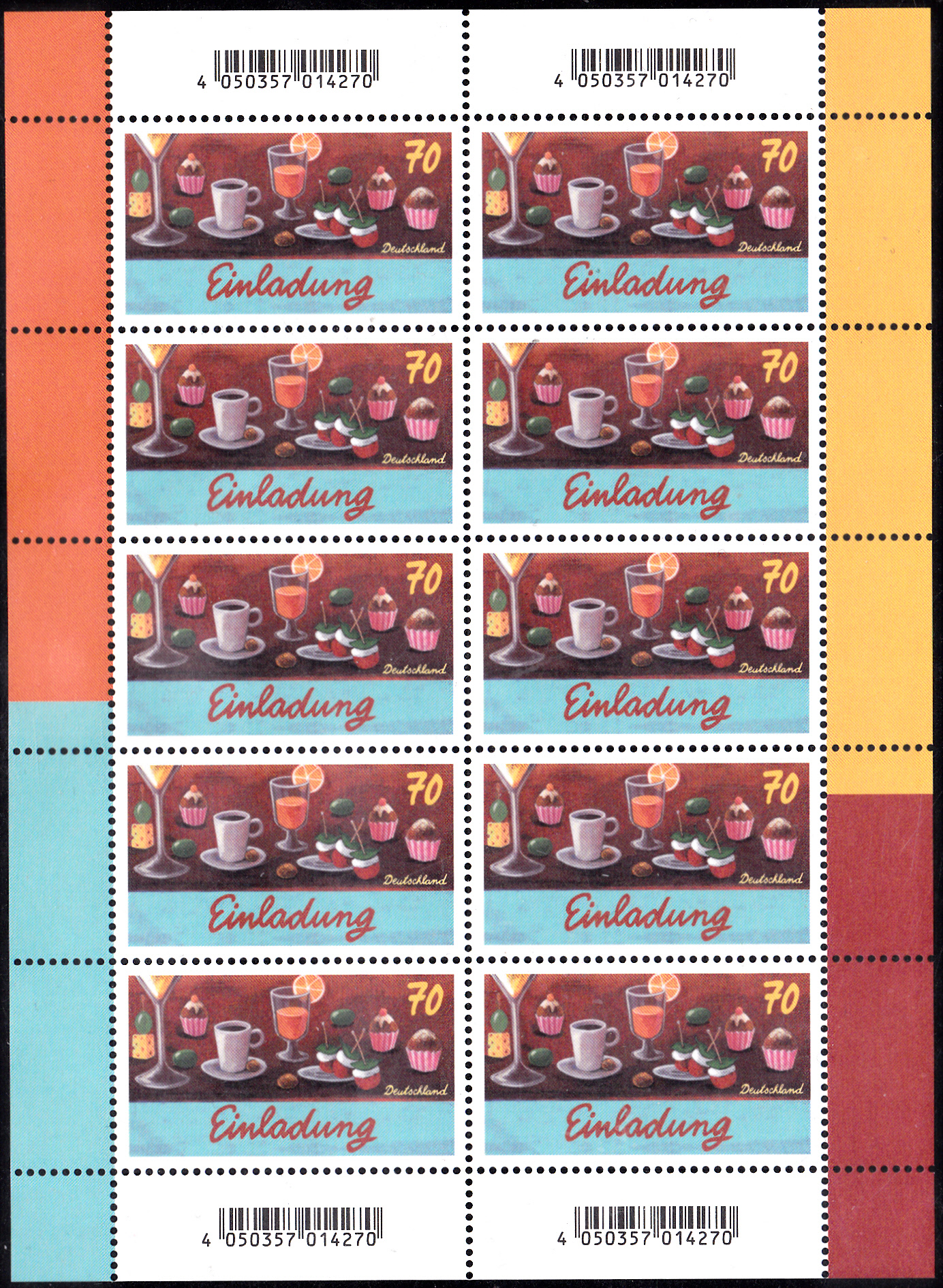Im Markenbild dieser "Einladungsmarke" der Deutschen Post AG (MiNr 3306) sind auch kleine Kuchen zu sehen.