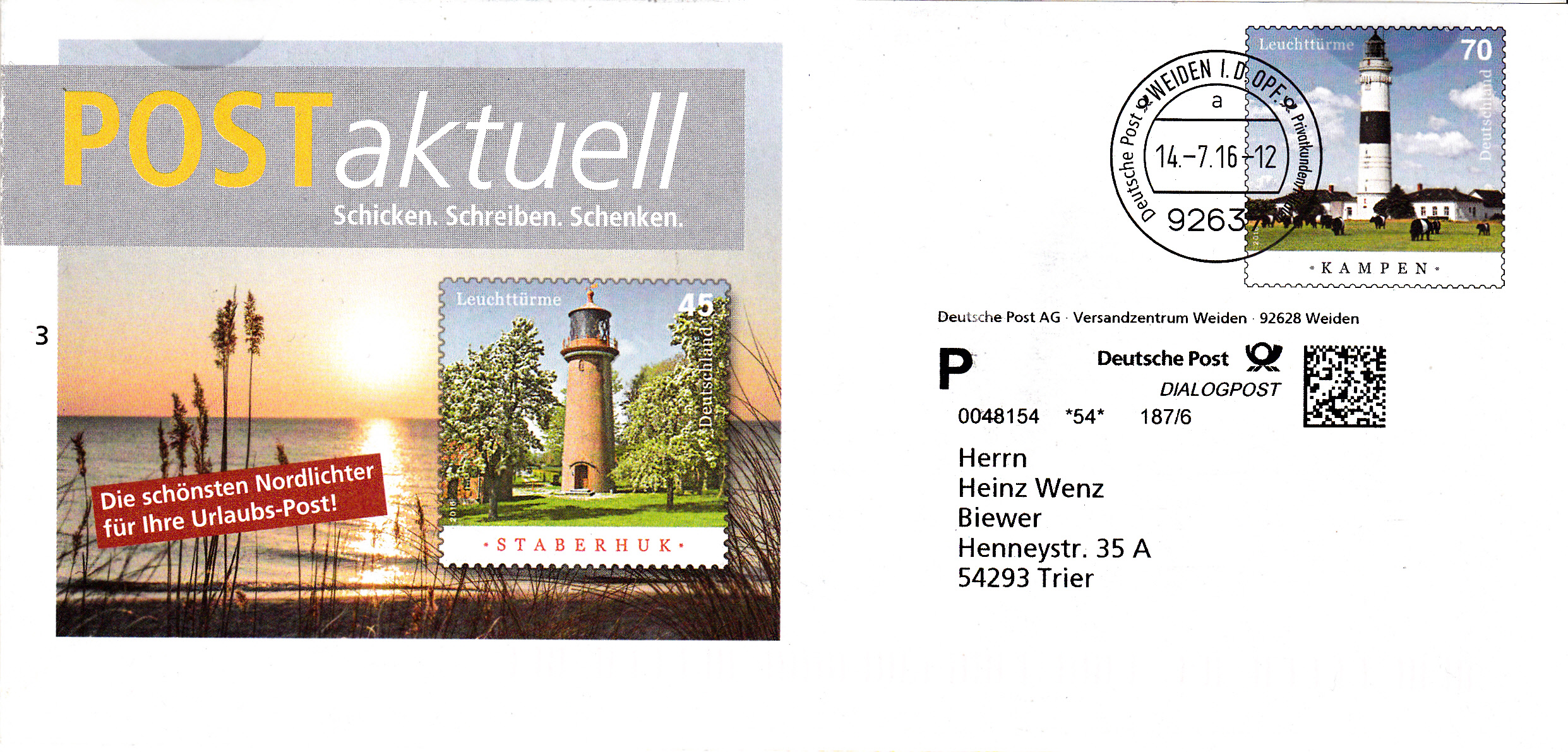 Faltbrief 210 mm x 102 mm mit Wertstempel der 70C-Marke Leuchtturm Kampen (MiNr 3253) mit aufgedruckter Zähnung und Vorausentwertung "Deutsche Post (Posthorn) WEIDEN I.D.OPF (Posthorn) Privatkunden/Filialen / a / 14.-7.16-12".