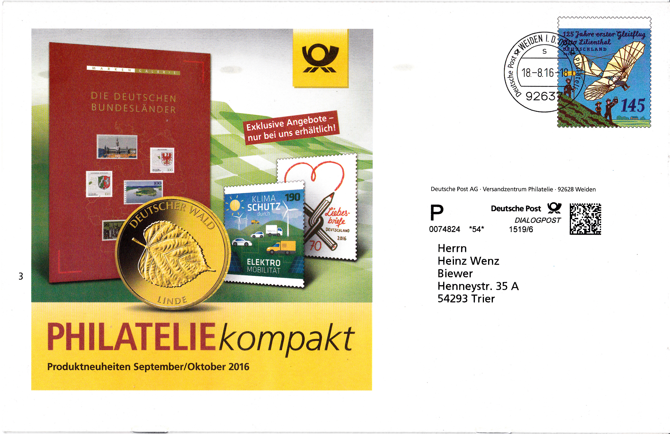 Kleine Broschüre (12 Seiten) im Format 235 x 152 mm als Eigenausgabe der DP AG mit Wertstempel "125. Jahrestag des ersten Gleitschirmfluges durch Otto Lilienthal" (MiNr 3254) mit aufgedruckter Zähnung und Vorausentwertung "Deutsche Post (Posthorn) WEIDEN I.D.OPF (Posthorn) Philatelie/ s / 18.-8.16-18".