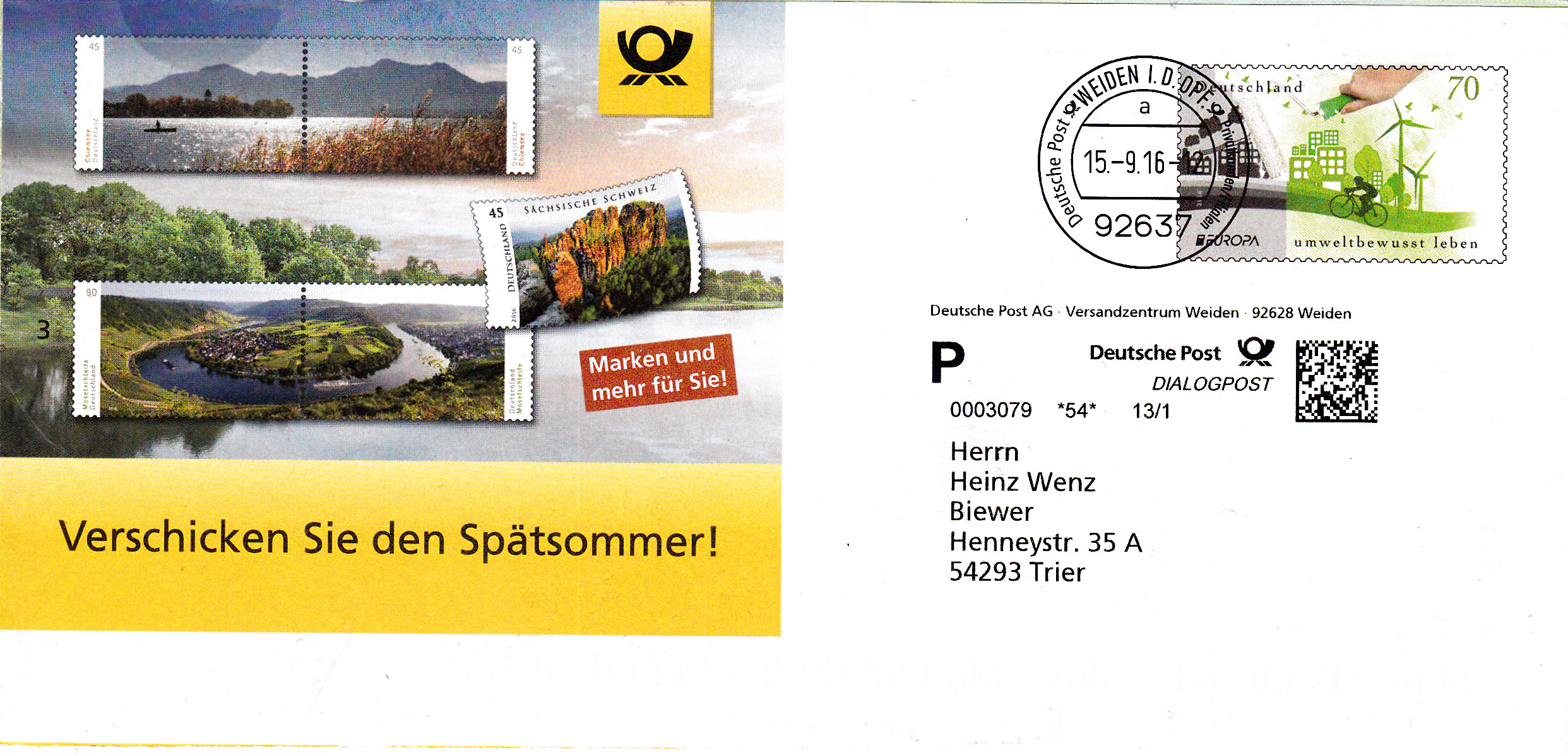 Faltbrief 210 mm x 102 mm mit Wertstempel der 70C-Marke Europamarke 2016 (MiNr 3238) mit aufgedruckter Zähnung und Vorausentwertung "Deutsche Post (Posthorn) WEIDEN I.D.OPF (Posthorn) Privatkunden/Filialen / a / 15.-9.16-12".
