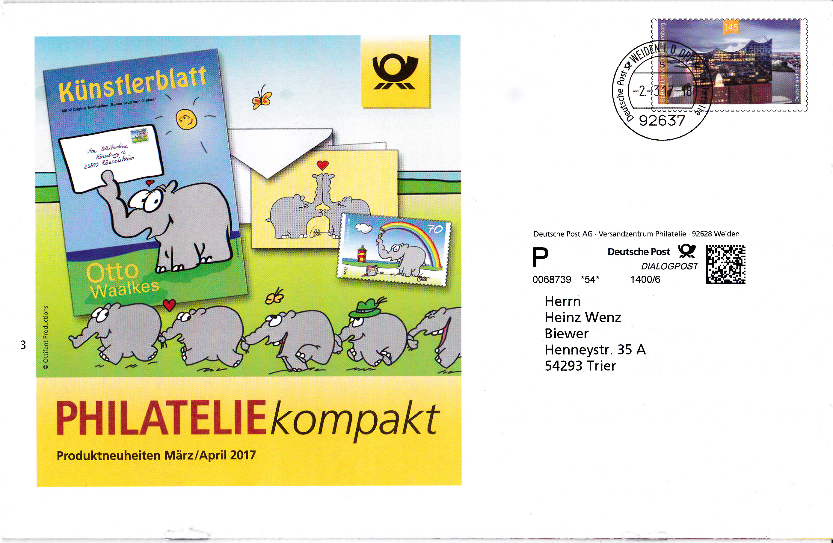 Faltbrief 210 mm x 102 mm mit Wertstempel der 70C-Marke mit der Zeichnung "Bunter Gruß vom Ottifant" von Otto Waalkes (MiNr 3292) mit aufgedruckter Zähnung und Vorausentwertung "Deutsche Post (Posthorn) WEIDEN I.D.OPF (Posthorn) Privatkunden/Filialen / a / -9.-3.17-12".
