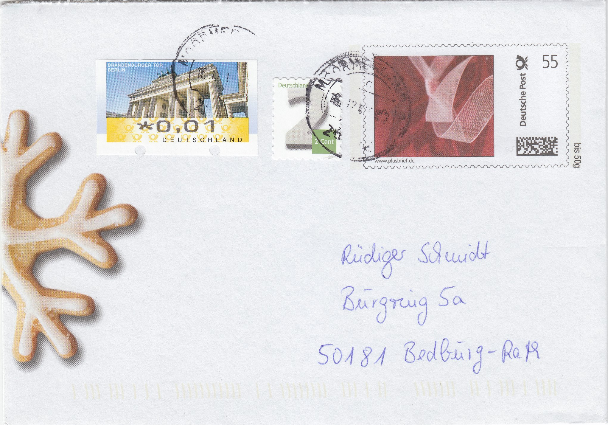 Die Sendung lief, als Portostufe Standardbrief zu 58 Cent, als Plusbrief mit Zusatzfrankatur in Form von einer ATM der Wertstufe 1 Cent sowie des neuen Ergänzungswertes zu 2 Cent: