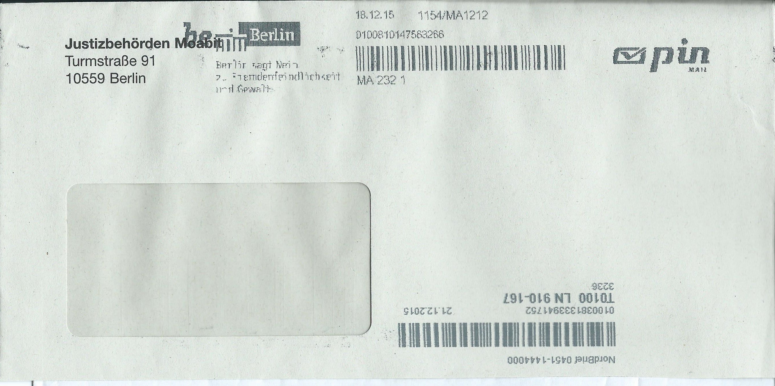 Den Anfang macht die pin-Mail aus Berlin: https://www.pin-ag.de/" target="_blank Briefaufgabe erfolgte am 18.12.15 und Weiterbearbeitung durch Nordbrief am 21.12.2015