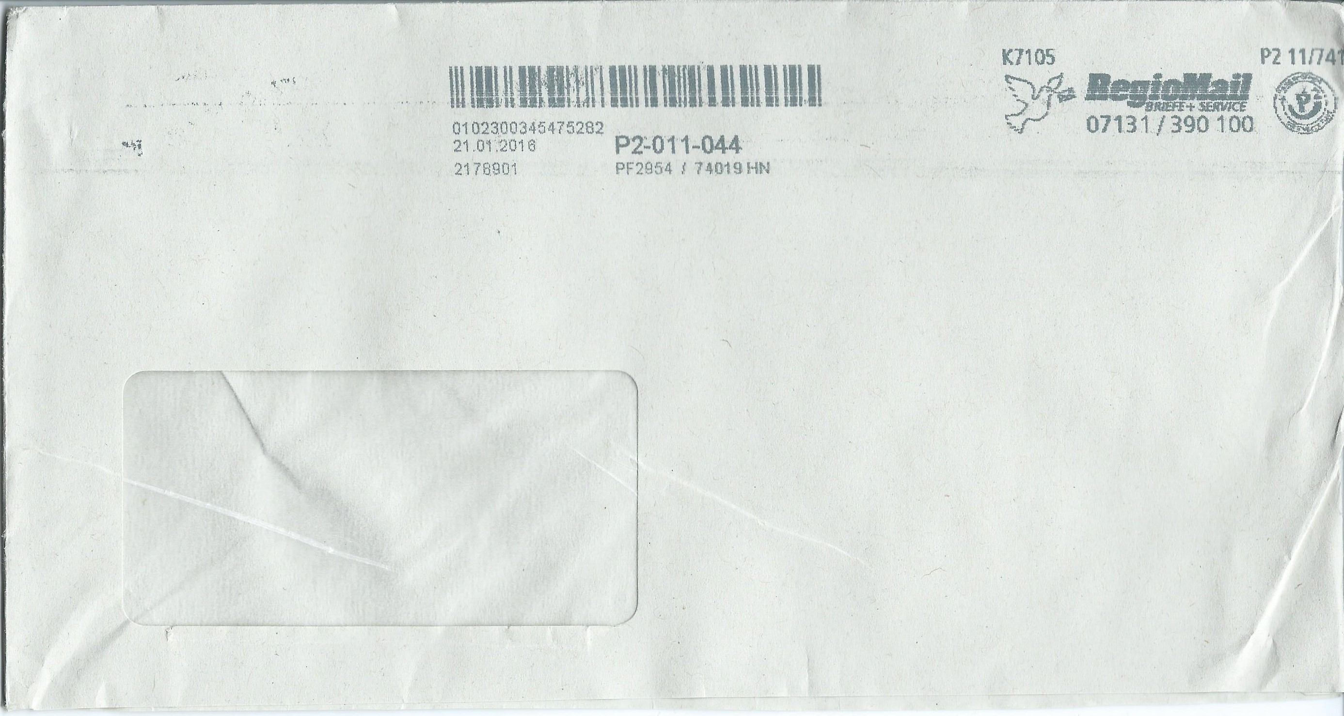 Als nächster Beleg einer von der RegioMail: http://regiomail.de/" target="_blank" target="_blank Aufgegeben am 21.1.16 und am 22.1.16 durch den Nordbrief weiter bearbeitet. Hier klebt das Nordbrief-Label auf der Rückseite.