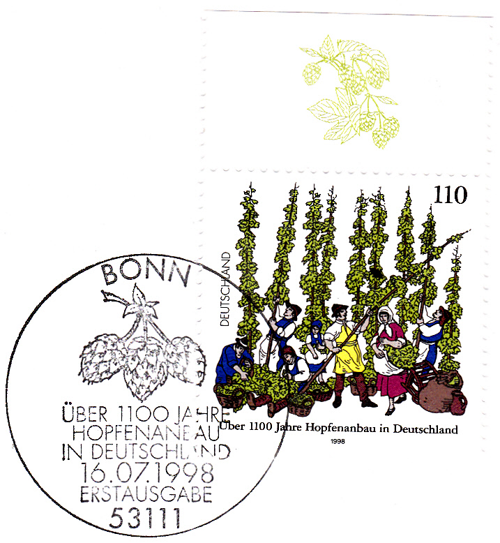 Diese Marke der Deutschen Post AG (MiNr 1999) erinnert an "Über 1100 Jahre Hopfenanbau in Deutschland". Im Markenbild wird die Hopfenernte gezeigt.
