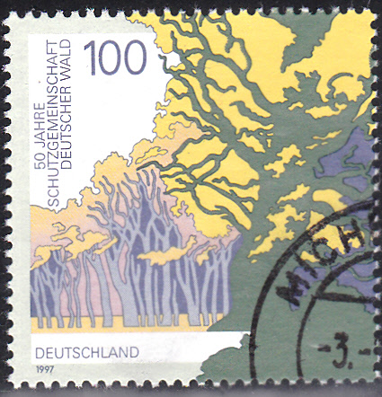 Zum Jubiläum "50 Jahre Schutzgemeinschaft Deutscher Wald" erschien 1997 diese Marke zu 100Pf mit der Abbildung eines Waldgebietes in Deutschland (MiNr 1918).
