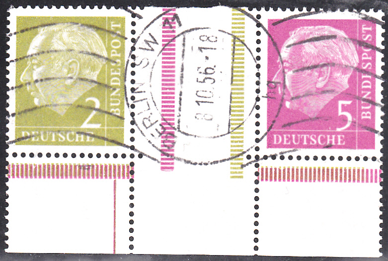 Gestempelter waagerechter Zusammendruck mit Zwischensteg MiNr WZ 11 (2Pf+Z+5Pf) aus dem Markenheftchenbogen MiNr MHB 4 vom unteren Bogenrand.