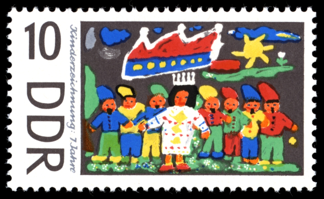 Am 01.06.1967 erschien in der DDR zum Internationalen Kindertag in einer Auflage von 8 Millionen Stück dieses Postwertzeichen, das Schneewittchen als "Kinderzeichnung: 7 Jahre" zeigt und als MiNr. 1281 katalogisiert wurde: