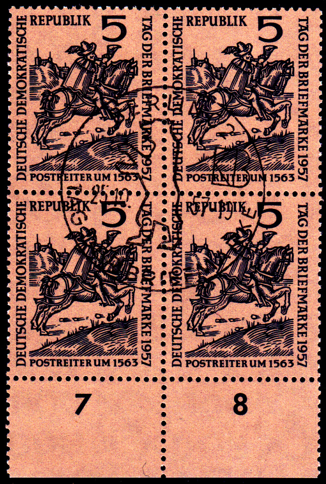 Viererblock der Marke zum Tag der Briefmarke 1957 mit Sonderstempel zum Tag der Briefmarke vom 25.10.1957 (Ersttag).