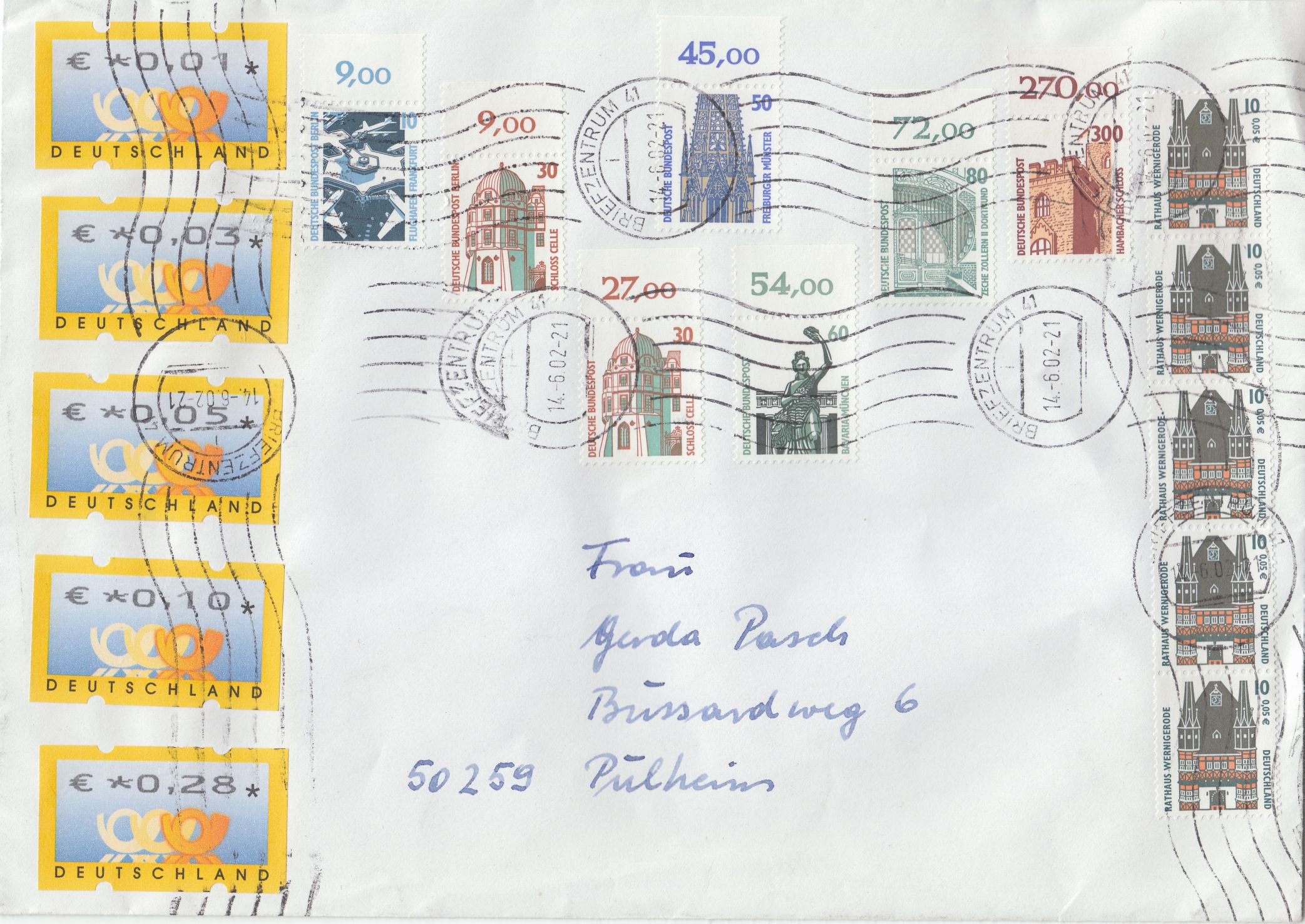 Demnach wurde der Beleg als "E E" = Einwurfeinschreiben aufgegeben, was im Jahre 2002 als Zusatzleistung 1,53 € kostete. Dazu kam das Briefporto für einen Kompaktbrief, das 1,12 € betrug. Somit ist der mit 2,75 € frankierte Beleg leider um 0,10 € überfrankiert.