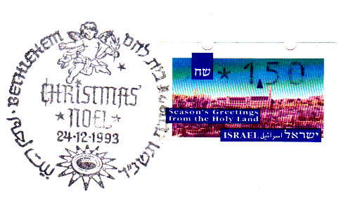 Sonderstempel aus Bethlehem vom 24.12.1993 auf einer Weihnachtsgrußmarke aus dem Automaten. Im unteren Teil des Stempels ist der mutmaßlichen Geburtsort in der Geburtsgrotte aus der Geburtskirche in Bethlehem abgebildet. Seine 14 Zacken symbolisieren die 14 Geschlechter im Stammbaum Jesu.