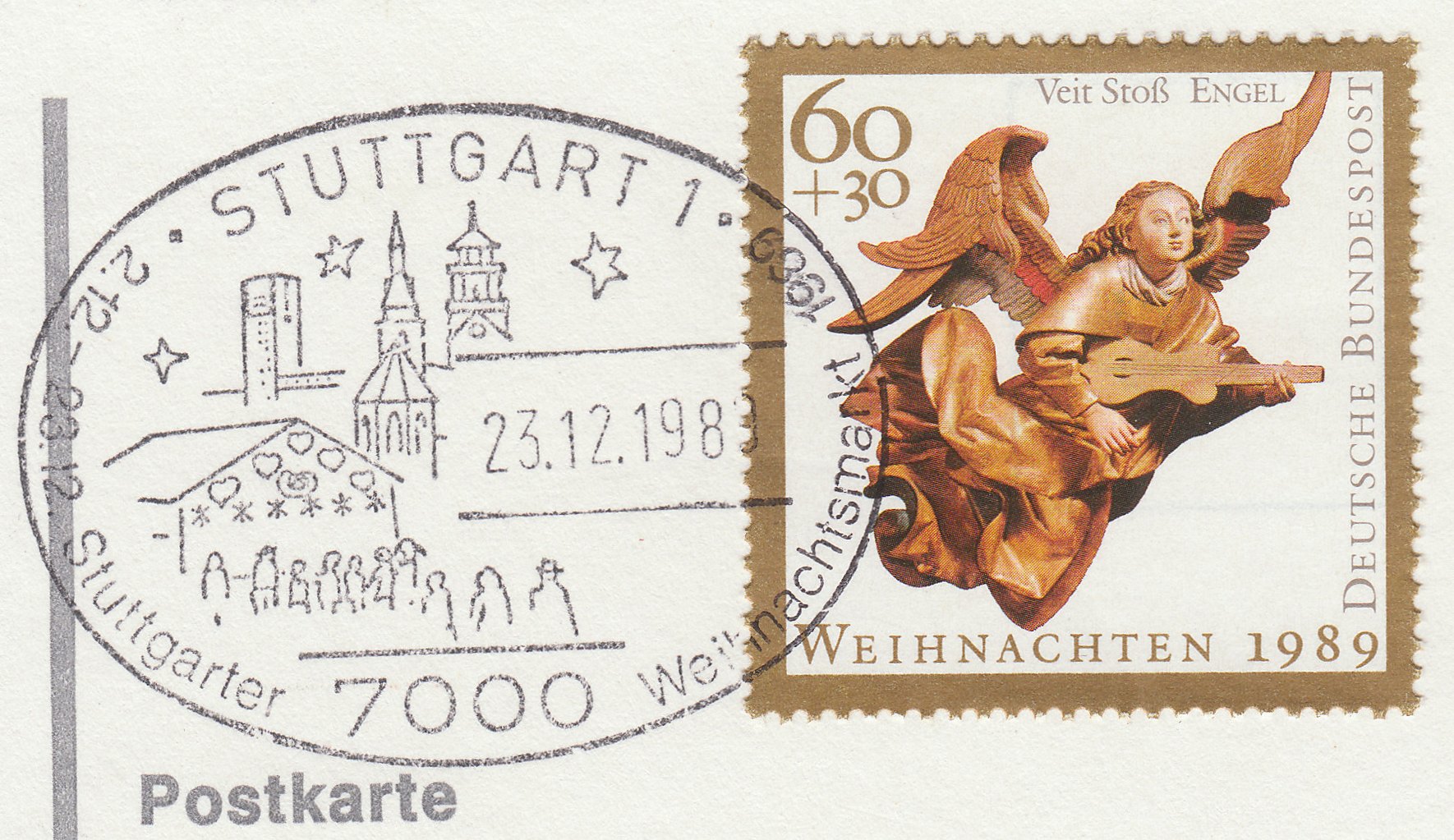 Sonderstempel zum Stuttgarter Weihnachtsmarkt 1989 mit Motiven aus Stuttgart sowie einer Bude auf dem Weihnachtsmarkt, wie von Heinz bereits aus dem Jahre 1998 gezeigt: