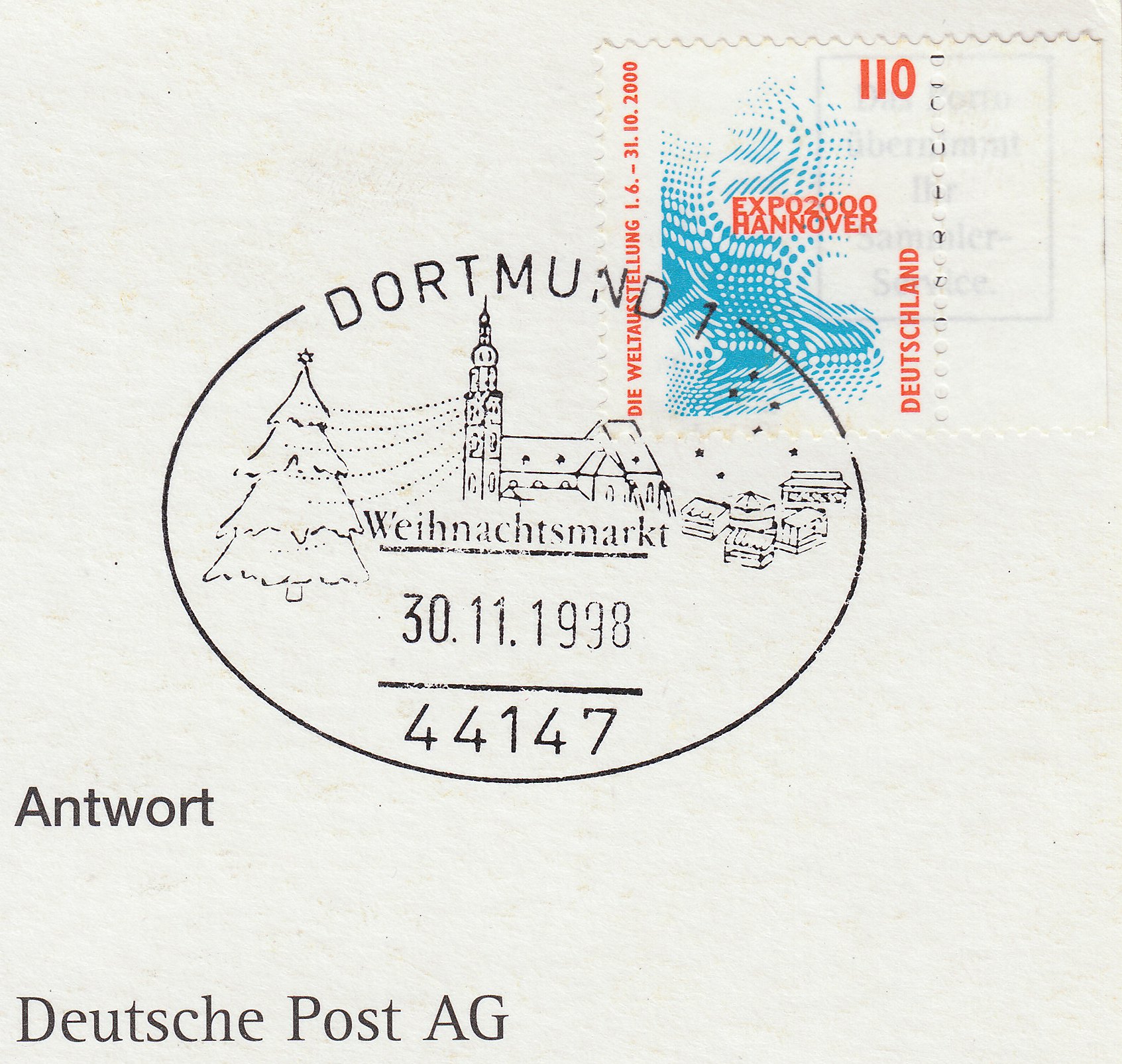 Dieser Sonderstempel aus Dortmund vom 30.11.1998 zeigt als Motive zum Weihnachtsmarkt einen großen Tannenbaum, Lichterketten und Buden: