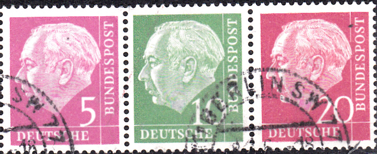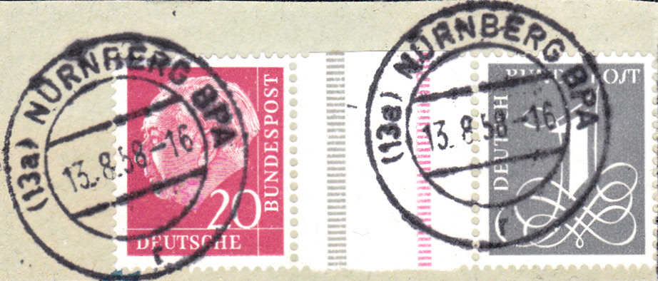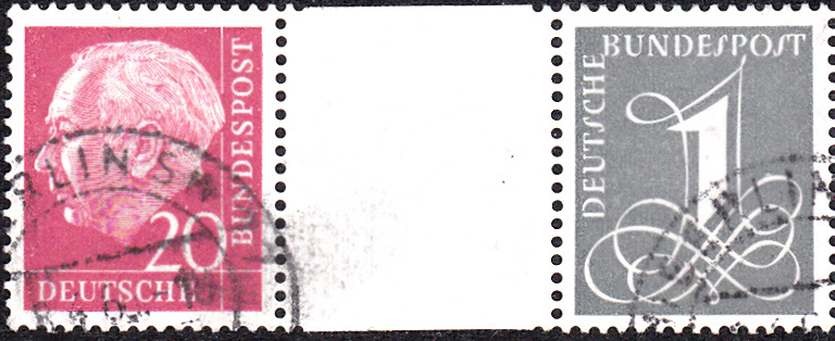 Gestempelter waagerechter Zusammendruck mit Zwischensteg MiNr WZ 16 b X (20Pf+Z b+1Pf) aus dem Markenheftchenbogen MiNr MHB 5 X. Der Zwischensteg b ist ohne Strichelleisten.