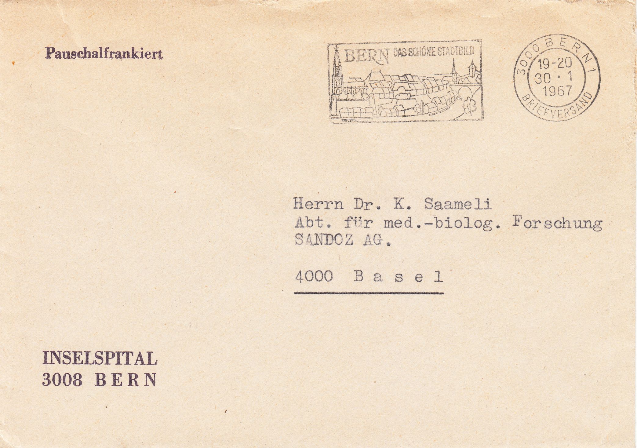Massendrucksachen wurden in der Schweiz ohne Frankatur aufgegeben mit dem eingedruckten Vermerk "Pauschalfrankiert", hier ein Beispiel vom 30.01.1967 aus Bern: