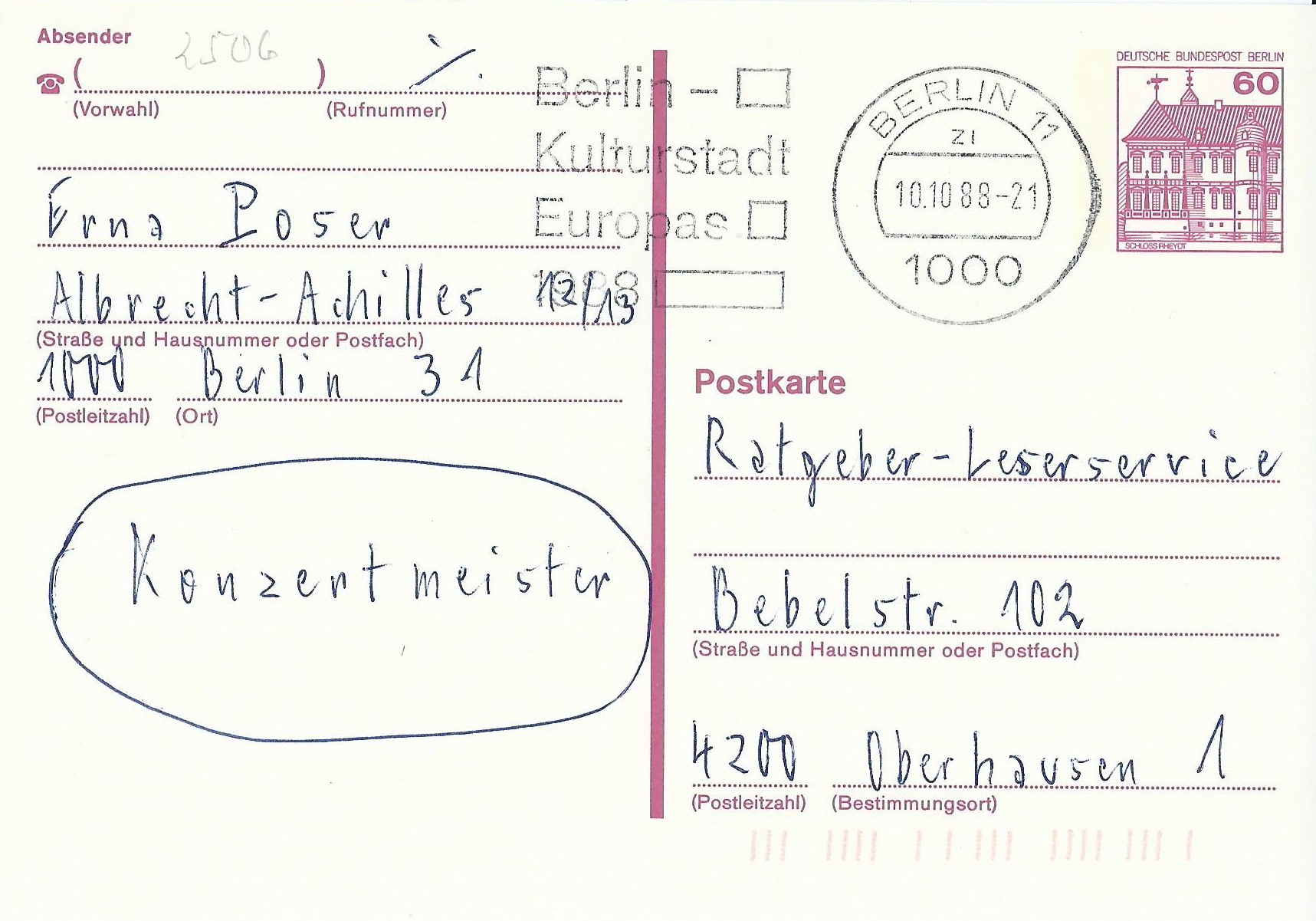 Einmal eine mit dem Wertstempel zu 60 Pf, gestempelt Berlin 11 am 10.10.88: