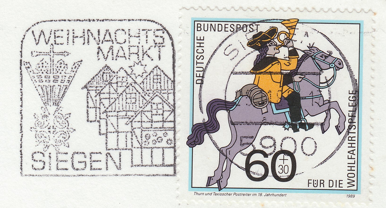 Maschinenstempel aus Siegen vom 25.11.1989 mit Werbeeinsatz zum dortigen Weihnachtsmarkt mit der Abbildung zahlreicher Marktbuden: