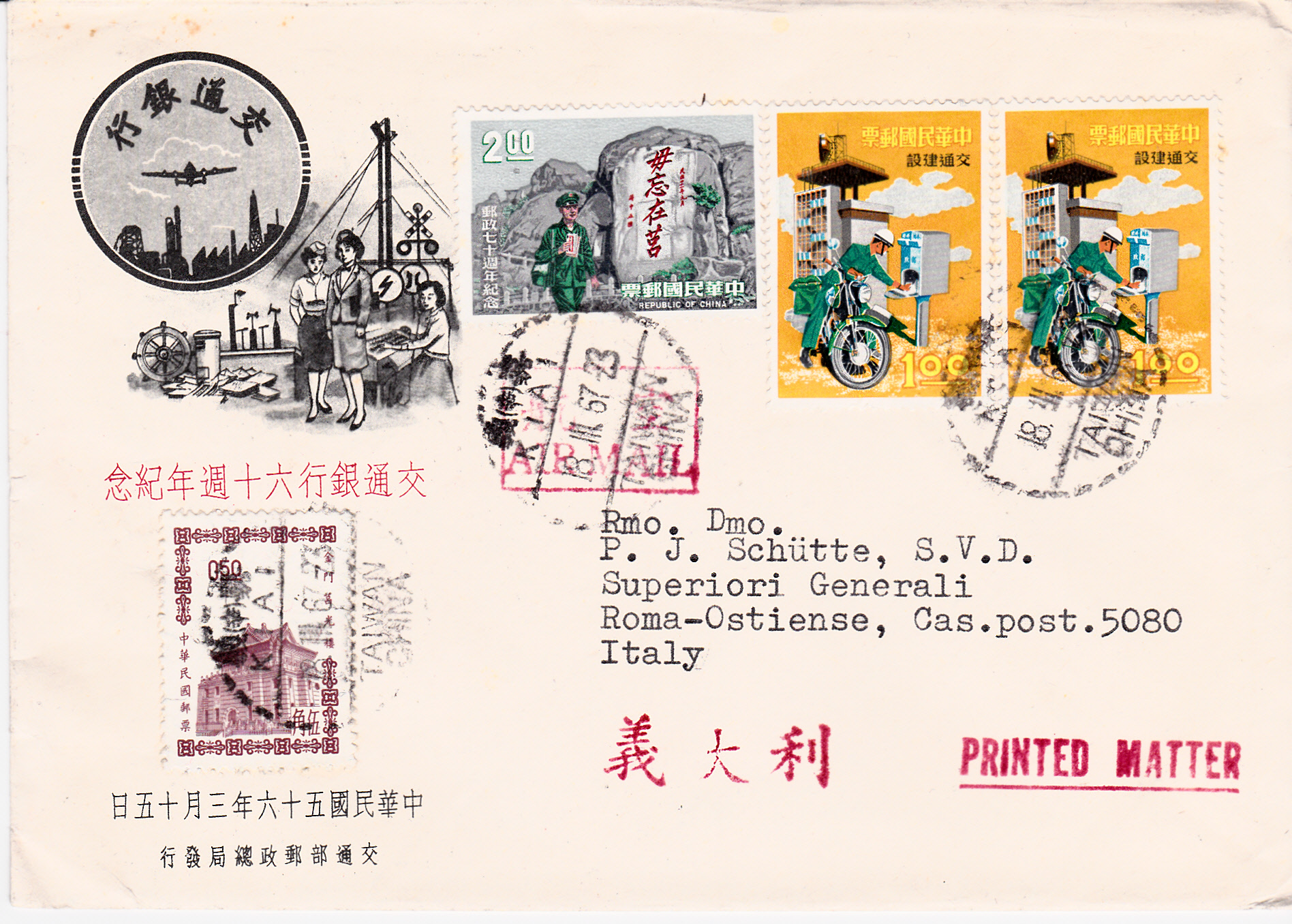 Drucksache mit Luftpost vom 18.3.1967 von Chiai nach Rom frankiert mit zwei Marken zu 1,00 $ aus der Serie "Modernisierung der Kommunikationsmittel" (MiNr 622) , einer Marke zu 2,00 $ aus der Serie "70 Jahre Staatliche Chinesische Post" (MiNr 596)und einer Marke zu 0,50 $ aus der Freimarkenserie "Chü-Kwang-Turm von Quemoy" (MiNr 519).