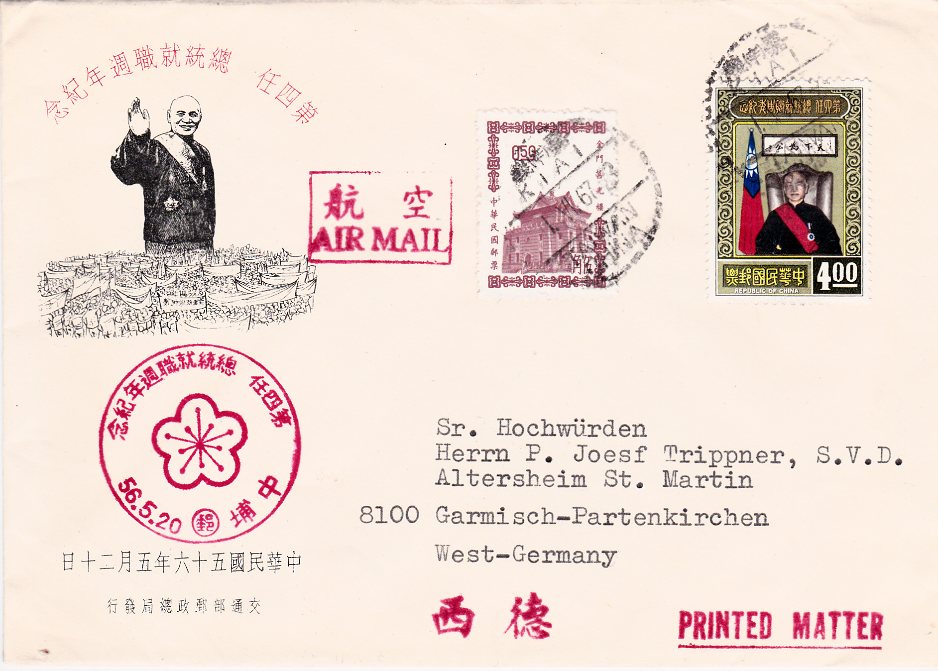 Drucksache mit Luftpost vom 1.6.1967 von Chiai nach Garmisch-Partenkirchen. Als Porto fanden hier die 4,00$-Marke der Ausgabe "1. Jahrestag des Beginns der 4. Amtsperiode von Präsident Chiang Kai-shek" und eine Marke zu 0,50 $ aus der Freimarkenserie "Chü-Kwang-Turm von Quemoy" (MiNr 519) Verwenmdung.