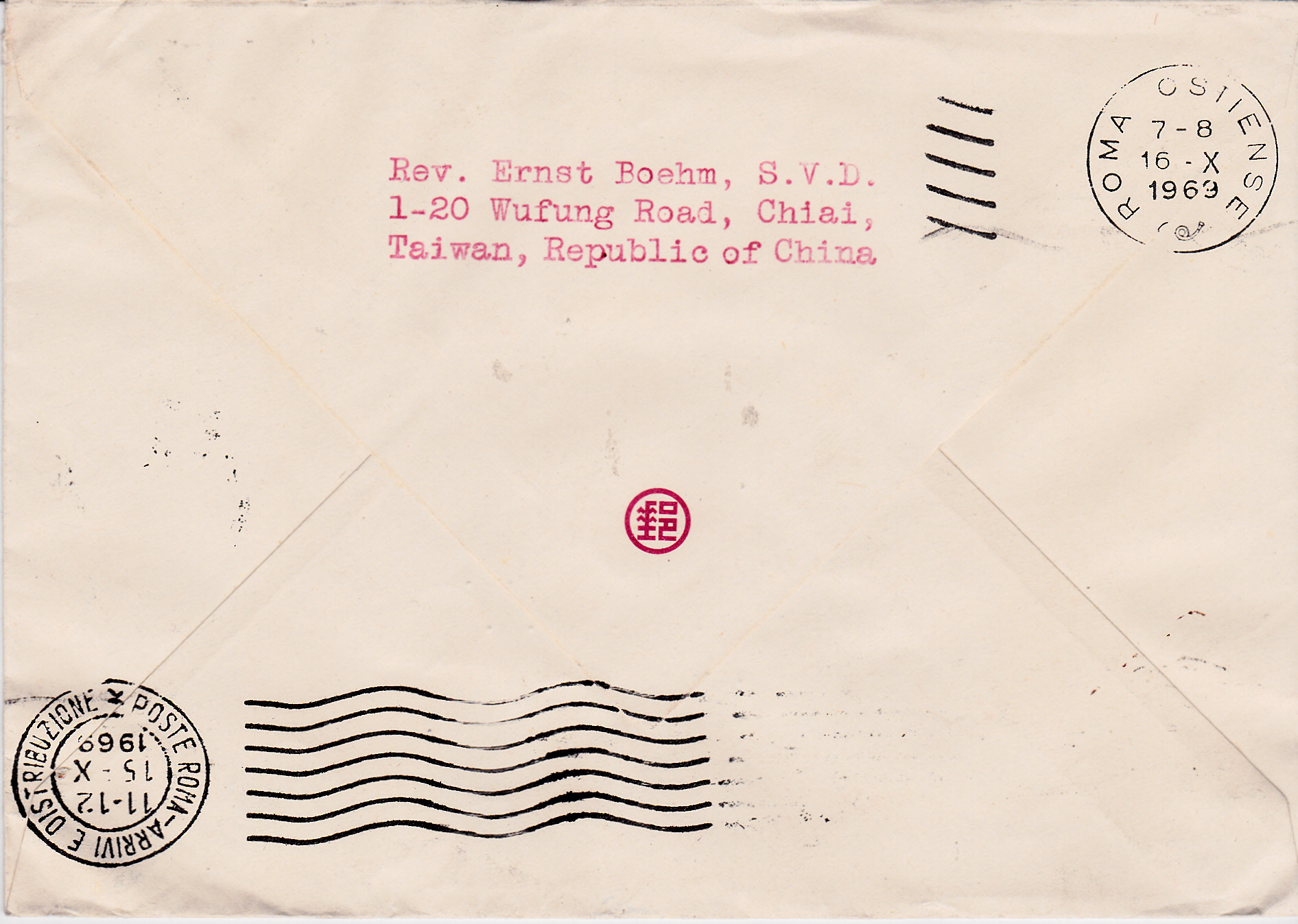 Drucksache mit Luftpost vom 21.3.1970 von Chiai nach Garmisch-Partenkirchen. Zur Frankatur wurden hier eine Marke zu 2,50$ (MiNr 764) mit der Abbildung von Yuanhua (eigentlich Hua Tuo gest. 208 oder 220, Mediziner) und zwei Marken zu 1,00$ (MiNr 760) mit Xuanzang (602-664, buddhistischer Mönch und Reisender).