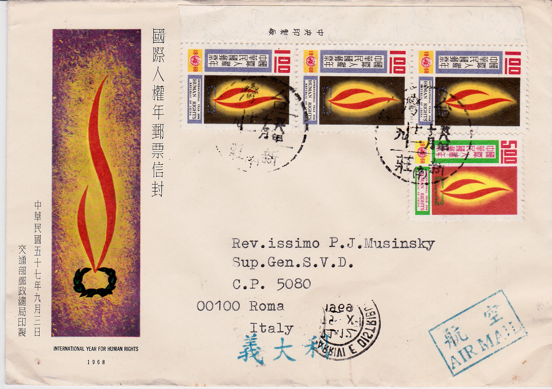 Drucksache mit Luftpost vom 18.3.1967 von Chiai nach Rom frankiert mit zwei Marken zu 1,00 $ aus der Serie "Modernisierung der Kommunikationsmittel" (MiNr 622) , einer Marke zu 2,00 $ aus der Serie "70 Jahre Staatliche Chinesische Post" (MiNr 596)und einer Marke zu 0,50 $ aus der Freimarkenserie "Chü-Kwang-Turm von Quemoy" (MiNr 519).