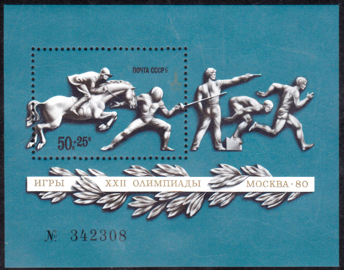 Auf diesem Block der UdSSR (MiNr 121 mit Marke MiNr 4647) werden alle Disziplinen des Modernen Fünfkampfs gezeigt.